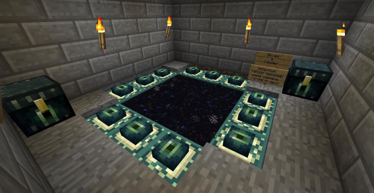On y trouve au rez de chausse un portail vers le Nether et au sous sol un portail vers l'ender, avec des coffres de l'ender.